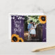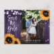 Rustic floral wedding save the date photo postcards featuring sunflowers and string lights on a barn wood background. Ideal card design for a purple rustic wedding party inspired by sunflowers. Monogram wedding save the date postcard.