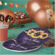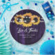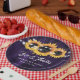 Rustic purple and sunflower wedding paper plates featuring sunflower flowers and string lights on a rustic wood background. Matching items available.