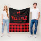 Rustic Red and Black Buffalo Check Family Name Christmas Blanket - features bold typography and graphics. Blanket reads "This house Believes" and is personalised with your family name or name. Blanket is accented in red and black buffalo plaid and prancing reindeer. Makes the perfect addition to your holiday decor. Wouldn't this look great draped over your favourite chair? Makes a thoughtful gift.