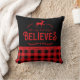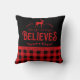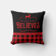 Rustic Red and Black Buffalo Plaid Family Name Throw Pillow - features bold typography and graphics. Blanket reads "This house Believes" and is personalised with your family name or name. Blanket is accented in red and black buffalo plaid and prancing reindeer. Makes the perfect addition to your holiday decor. Wouldn't this look great thrown on your favourite chair? Makes a very thoughtful gift.