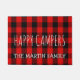 Trendy, but classic red plaid rustic home decor gift for rvers, retired travelers, campers, and nature lovers is this personalised doormat that reads- Happy Campers with a template for adding family name below in white letters. Against a popular background of black and red, cosy buffalo plaid pattern or also called lumberjack plaid or checks. Unique retirement gift, too. Would be right at home in front of an RV or cosy log cabin. Would be perfect for the winter holiday season.