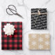 Rustic modern gift wrap set features three coordinating holiday wrapping paper sheets: red and black buffalo plaid, black with white script "Merry Christmas" text, and kraft tan brown with white winter snowflakes pattern.