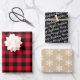 Rustic modern gift wrap set features three coordinating holiday wrapping paper sheets: bright red and black buffalo plaid, black with white script "Merry Christmas" text, and kraft tan brown with white winter snowflakes pattern.