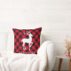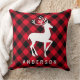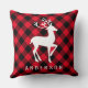 Square holiday accent pillow features a family monogram of your last name (or other text) with a rustic bright red and black check plaid buffalo patterned frame and white reindeer silhouette.