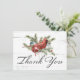 Send a personalised note of thanks to family and friends with this rustic holiday note card. This design template features a red cardinal perched on a branch with red berries and shiny Christmas balls in a background of white weathered wood. Below it reads "Thank You" in a modern black script. Customise with your name in green. The back of the card has a personalised thank you message and signature. Designed by Susan Coffey.