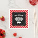 Casual backyard pig roast BBQ themed birthday party napkins feature a black decorative frame, western style fonts, star accents, and a red gingham tablecloth plaid border design. Personalise the age number.