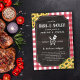 Rustic red gingham bbq baby shower invitation with printed wood grain, yellow sunflowers, and crossed grill utensils framing the date of your backyard baby-q shower.