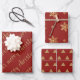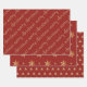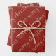 An elegant set of three coordinating wrapping paper sheets in a festive burnt red and gold palette. One has Merry Christmas written in a modern handwritten font. The second features an abstract Christmas tree pattern and the third sheet has a snowflake pattern.