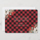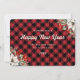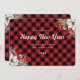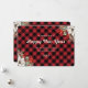 Red buffalo plaid New Year card featuring falling snow and a watercolor painting of poinsettia, holly and red berries. Easily personalize online.
