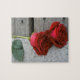 A puzzle featuring a photo of two red roses over a background of barnwood.