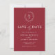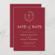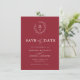 A tasteful and classic choice in wedding Save the Date cards, this design conveys a simple elegance in its text layout and classic style. A simple open laurel wreath of sketched leaves surrounds the monogram initial of the bride and groom over a romantic rustic red background. The elegant yet simple text template has a sample text template to personalise with your desired information.