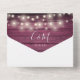 All in one wedding invitation with pretty string lights, signature style names and chic typography on a rustic burgundy red wood background. The invitation includes a perforated RSVP card with your wedding website QR code and Details. Designed by Thisisnotme©