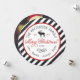 Affordable custom printed holiday photo cards with simple templates for customisation. This fun design features a circle die-cut shape with striped background, a reindeer graphic and modern rustic typography in red, white and charcoal grey colours. The text reads "Merry Christmas" in a trendy script font. Personalise it with your family names, the year or other custom text. Reverse side has space for photos or additional text. Use the design tools to edit the text, add more photos and create a unique one of a kind round Christmas photo card.