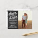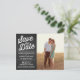 Photo save the date announcement featuring retro typography on a chalkboard background.