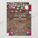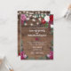 Hanging fairy or string lights are strung across a faux wood plank background. Bouquets of roses in white, red, and pink and greenery done in a watercolor effect make a striking border on this wedding invitation. Available with matching products.