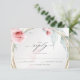 painted blush rose pink peony flowers and pale sage green eucalyptus leaves surrounding a multi gold round frame in gold . Handwritten calligraphy accents, the back is a coordinating colour - This is part of a design coordinated wedding suite collection designed by the BarefootBride™.