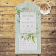 ALSO AVAILABLE IN STYLES WITHOUT DINNER OPTIONS OR WITH A QR CODE. This wedding invitation exudes an elegant charm with its delicate design elements. Against a backdrop of light sage green, the invitation carries an air of tranquillity, creating a soothing and serene atmosphere. The green background, gently distressed with white, adds a touch of vintage sophistication. At the heart of the invitation, a centred white text box takes prominence, serving as the focal point. The pristine white colour of the text box provides a striking contrast against the serene green backdrop, ensuring the text stands out with clarity and elegance. Surrounding the text box is a frame adorned with exquisite watercolor botanical greenery. The intricate botanical elements are expertly crafted, adding a natural touch and a sense of enchantment to the design. These delicate greenery details continue beyond the frame, gracefully extending to the outside of the invitation, as if nature itself has embraced the occasion. Overall, the wedding invitation presents a harmonious blend of light sage green, distressed white, and delicate watercolor botanical greenery. Its timeless beauty and attention to detail promise to captivate guests and set the tone for a magical and unforgettable wedding celebration. Created by Simply Farmhouse Press.