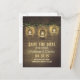 rustic save the date postcards with wooden background and garden lights - lanterns hanging on the tree branch