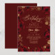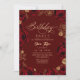 Modern stylish flowers birthday party invitation burgundy with gold roses, dust on with a gold ink pour effect (the gold is a digital effect, not real foil) and modern calligraphy. Classy and elegant, simple and modern invitation.