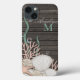 Rustic Seashells & Wood Personalised iPad Air Barely There Case, designed with a rustic "on the beach" illustrated theme, with a dark wood pattern, sandy seabed, and assorted seashells, coral, kelp, and bubbles, and personalised with your name, or has an option for just your monogram initial.
