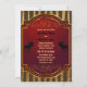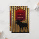 This rustic wedding invitation features a silhouette moose with a strand of golden aspen trees as the background. They are decorated with an ornate red and gold plaque and wedding text . Some graphics by Origins Digital Curio at www.etsy.com/shop/OriginsDigitalCurio