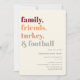 A simple design with a focus on bold typography in fall colours, with a header that reads" family, friends, turkey and football" includes a template on the back for an extra message for friends and family.