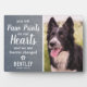 Personalised pet memorial plaque featuring a photo of your beloved pet, a rustic faux grey slate background, and a sympathy quote that reads "you left paw prints on our hearts and we are forever changed", a paw print, heart, your dogs name, and the dates. A wonderful keepsake and tribute of your precious family pet dog or cat.