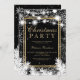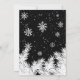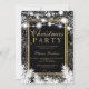 A rustic winter Christmas party with snowflakes illustration, white string lights with white pine tree branches on black background with an elegant script typography.