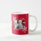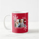 Enjoy hot cocoa or your coffee with this festive holiday mug in a deep red with rustic snowflakes, a photo that is mirrored on the back with the family name below.