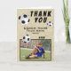 Rustic Soccer Football Sports Thank you Coach. Soccer thank you coach card with photo, thank you text, coach name, team name, year, your name and soccer balls. The background is beige rustic background. Photo thank you card - add your photo into the template. Personalise the card with names and your text.
