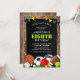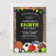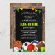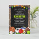 These birthday invites are a game changer! Fun colourful sports themed birthday party invitations, featuring a rustic wooden and black chalkboard background, decorated with tiny white stars, a rainbow banner, green grass and array of sports equiptment (football, volleyball, basketball, hockey puck, rugby ball, tennis ball, snooker ball, golf ball, and even a ping pong ball!). The modern template is easy to personalise. To change the text colour, font or size just click 'customise further'. This invitation is perfect for any age, any gender and any sports themed party.