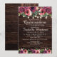 Quinceañera birthday party invitation with a rustic dark brown barn wood background and twinkling string lights with pink and burgundy watercolor floral. Contact us for help with customisation or matching products.