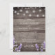 Rustic wood print with lavender and white string lights wedding invitation with QR code in the back to RSVP.