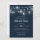 Affordable custom printed wedding rehearsal dinner invitations with an easy to use template for customisation. This rustic chic design features strands of glowing string lights and mason jars on a dark navy blue background. Personalise the invite with your rehearsal dinner party details or customise the text to use for any event. Use the design tools to choose any background colour, add photos and customise the text fonts and colours to make a unique design for your wedding rehearsal party.