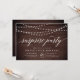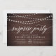 Our festive surprise party invitations feature a rustic wood plank background with strings of glowy white lights across the top, and "surprise party" in chic calligraphy script typography. Personalise with your surprise celebration details beneath in white; can be used for any occasion, like birthday parties or anniversary parties.