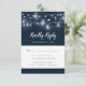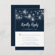 Affordable custom printed wedding RSVP cards with an easy DIY template for customisation. This rustic chic design features strands of glowing string lights and mason jars on a dark navy blue background. Personalise the design with your wedding reply details - including meal options if needed - or customise the text to use for any event. Use the design tools to choose any background colour, add photos and customise the text fonts and colours to make a unique design for your wedding.