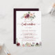 This rustic summer floral calligraphy confirmation invitation is perfect for a simple religious event. The design features burgundy, pink and blush watercolor flowers with green leaves in a brownish stained background.