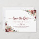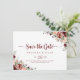 This rustic summer floral horizontal wedding save the date is perfect for a modern wedding. The design features burgundy, pink and blush watercolor flowers with green leaves in a brownish stained background.