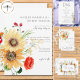 This simple but elegant wedding invitation design features a rustic watercolor bouquet of red, yellow, brown, cream, burgundy, and purple meadow wildflowers with greenery. The sunflowers are featured prominently in this design. It's part of the Rustic Summer Wildflowers & Sunflowers Wedding Suite created by Simply Farmhouse Press.