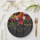 Custom wedding paper plates featuring a rustic big beautiful yellow sunflowers and red burgundy roses bouquet and faux gold typography script on a dark brown barn wood background with string lights. Ideal for your summer or autumn fall elegant rustic country outdoor backyard vintage traditional themed weddings. Personalise it with the bride's and groom's names and wedding details!