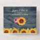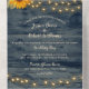 Announce your special day with this rustic all-in-one wedding invitation featuring navy barn wood, lace details, string lights, and vibrant sunflower accents. This convenient folded design includes an RSVP card and mailing panel—no envelope needed! Perfect for country weddings, barn venues, or sunflower-themed celebrations. Personalise with your names, wedding date, location, and guest response details.