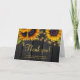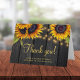 Rustic elegant wedding stylish thank you template card on dark brown barn wood background featuring beautiful sunflower bouquets. F+++++++++++++++++++ Suitable for elegant summer or autumn fall rustic countryside farmhouse barn garden backyard weddings.