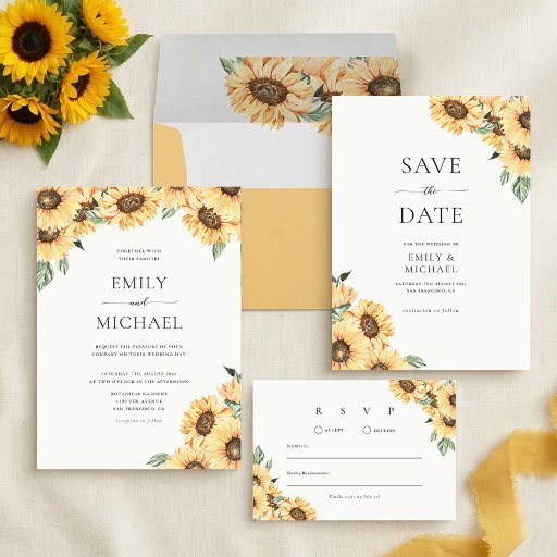 Complete your wedding stationery suite with a rustic sunflower envelope. Yellow watercolor florals and fresh leaves cascade beautifully from the inside. It provides the perfect country chic touch for couples mailing out late summer of fall / autumn wedding invitations. Perfect for couples planning an outdoor garden ceremony or a bright and colorful botanical theme .