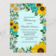 Rustic country christening invitation featuring vibrant sunflowers, traditional white daisies and teal flowers against a light aqua background with baby's breath and botanical greenery accents