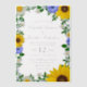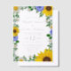 Rustic country wedding invitation featuring vibrant sunflowers, traditional white daisies and light blue flowers with baby's breath and botanical greenery accents