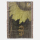 Close up photo of a quarter sunflower with a digital aged and fold process with gold, glitter string lights and chandelier, and a bee in the lower right corner.