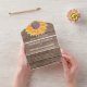 It is decorated with sunflowers in shades of yellow with a brown barn wood background.