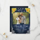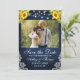 Rustic Blue Wood String Lights Watercolor Sunflower Floral and Greenery Lace Wedding Save The Date Card