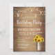 Rustic birthday invitation on wooden board featuring watercolor sunflowers in a milk bucket and decorative string lights.