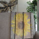 A sunflower fades into distressed wooden planks.
